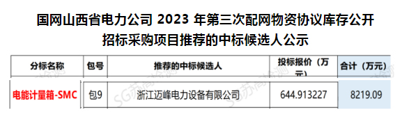 在《国网山西省电力公司 2023 年第三次配网物资协议库存公开招标采购项目推荐的中标候选人公示》文件中,迈峰电力中标电能计量箱标段644.913227万元。